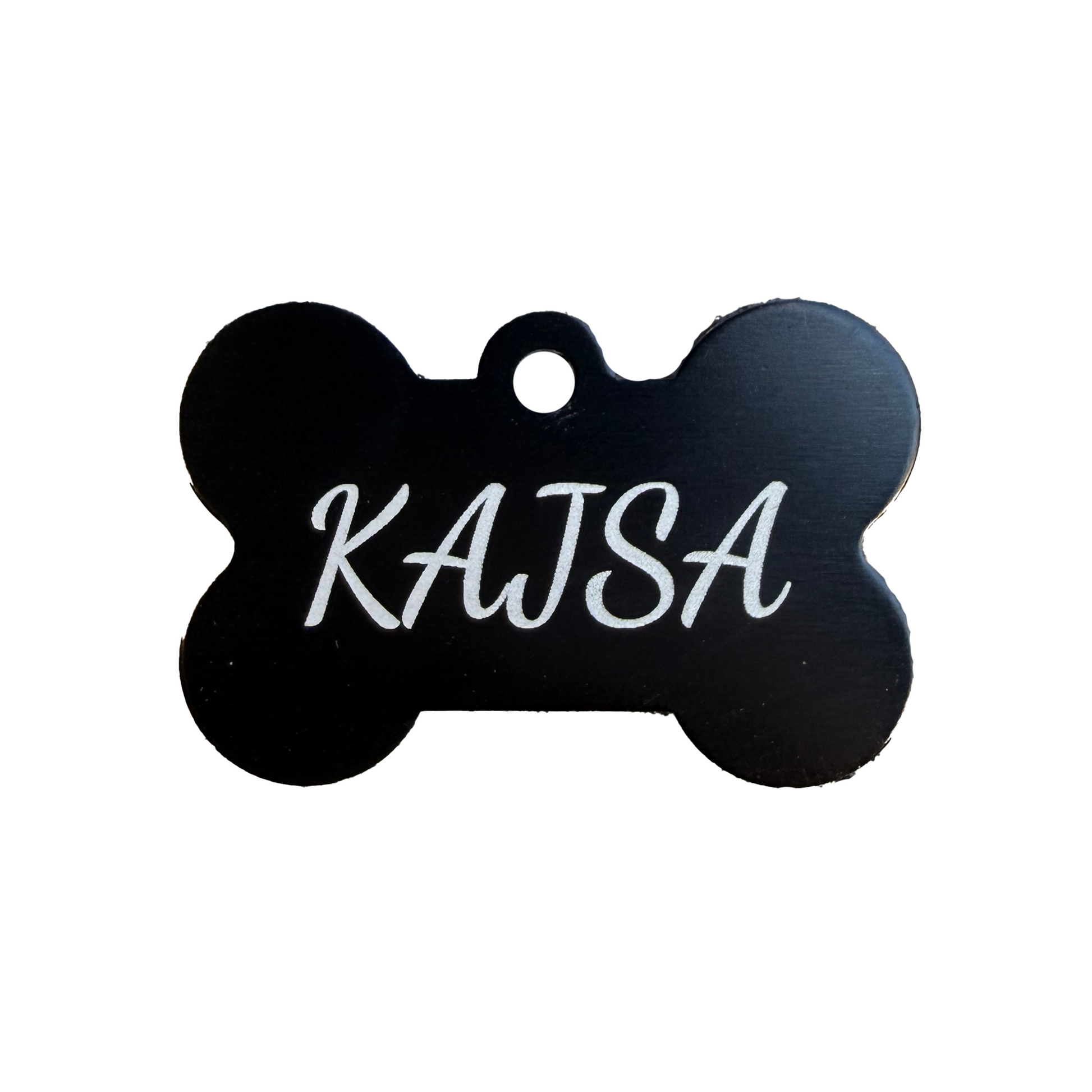 Ge din fyrbenta vän en snygg och praktisk accessoar! Vår hundbricka i klassisk benform är tillverkad i slitstark metall och graveras med tydlig, vit text som håller över tid. Perfekt för att skriva namn på framsidan och kontaktuppgifter på baksidan – en trygghet om din hund skulle komma bort.